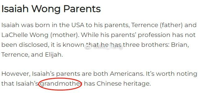 我们在对Isaiah Wong的信息进行英文报道的检索之后,可以看到包括维基百科及各大英文媒体确有这样的简单描述,他的曾祖父是中国人,这也是英文媒体当中最主流说法,也是所有国内中文报道的信息源。