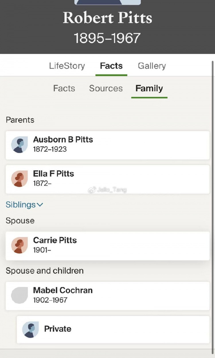 顺着逻辑,我们尝试定位他的曾祖母Mabel Wong的“华裔血统”。根据讣告显示,Ausborne 出生于新泽西最大城市Newark,那么意味着Mabel夫妇应该曾定居在这个地方,我们围绕Mabel Wong这个名字在纽瓦克相关的所有档案中进行了大量的搜索,但是没有一个Mabel Wong是我们想找的这位。于是我们调头,从他的祖父Robert Pitts,一个来自佐治亚州的黑人入手,并且找到了多个公开的Pitts家族树信息。根据家族树的显示,Mabel全名叫Mabel Cochran,一个来自弗吉尼亚人的白人女姓,她的父亲和妹妹都姓Cochran,显然这才是她的本姓。