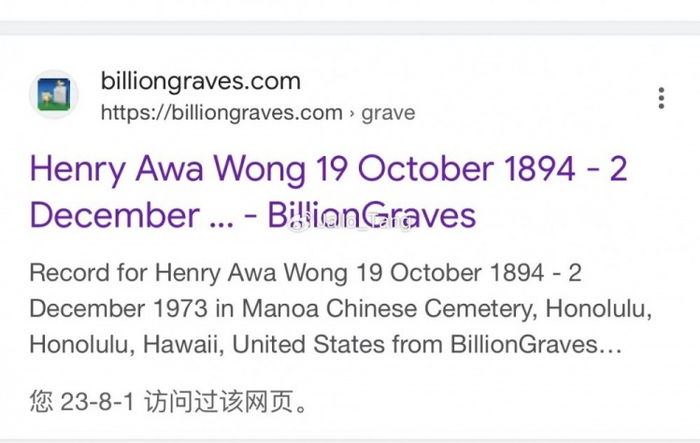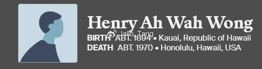直到我们在夏威夷的考艾岛(Kauai)找到了一个名叫Henry Ah Wah Wong的人,这个名字存在于一个夏威夷Wong家族的家族树上,但并不存在于官方档案里,这也意味这,Henry Ah Wah Wong并不是一个正式的名字。我们通过对他的家庭成员分析,将他最终还原到一个叫Henry Awa Wong的人身上,而这个人的经历与Mabel的前夫Henry Wong Wah高度重合。