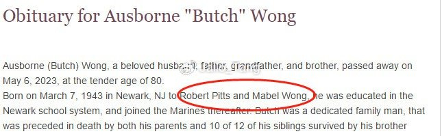 于是我们祭出找人神器——美国的黄页网站,这种类型的网站美国有很多,除了可以定位到目标人物的居住地、联系方式之外,还能关联到他的主要亲属。借助这个网站我们成功定位到了他的祖父母,Ausborne Wong和Rosemary Wong。关于Ausborne的信息同样不多,甚至可以说少的可怜,好在我们发现了他去世时候的讣告。这个讣告清晰的显示,他的父亲叫Robert Pitts ,母亲叫Mabel Wong。出乎意料,Wong这个姓氏,实际来自他的曾祖母。