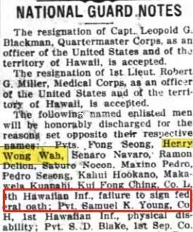 奇怪的是,Henry Wong Wah作为一个天生的美国公民,他在整个可检索的美国各类档案记录里只出现了一次,就销声匿迹了,只有一份1917年夏威夷老报纸关于美国国民警卫队退役士兵的报道中提到了他和另外一些人没有签署联邦誓言。