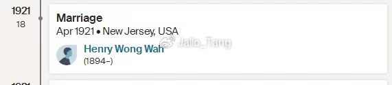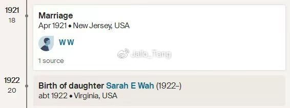 通过继续对Mabel Cochran的婚恋历史进行研究,我们发现另一个家族树中提示了她曾经跟一位名叫W.W的男士有过关系,他们1921年的4月在新泽西登记结婚。二人共育有三女一男,长女Sara在1922出生,小儿子Harold在1926年出生。Mabel与W.W所生的子女皆以Wah为姓。那么如果两个W中一个是Wah,那另外一个会不会就是Wong呢?我们继续往下看,同样是来自第三个不同的家族树,显示了W.W的全名,Wong Wah,或者Henry Wong Wah。真相大白,Mabel的Wong居然是夫姓,那Pitts又是什么情况?