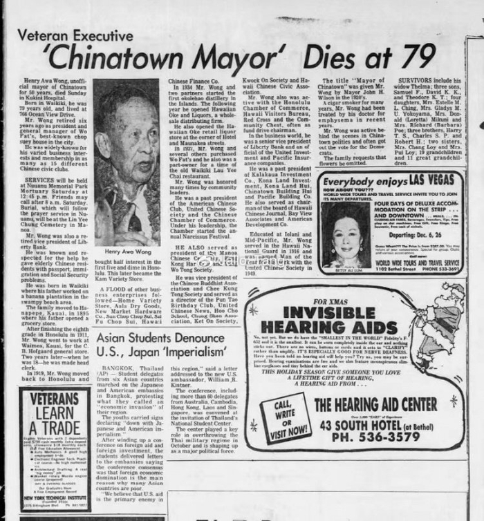 这位Henry Awa Wong并不是个默默无名的人,甚至十分有名,他叫黄仕华,祖籍广东中山谷都雍陌乡人,我们简单来列一下他的头衔:檀香山华埠市长、华人俱乐部主席、华人联合会主席、华商协会主席,还曾担任夏威夷莫阿纳华人公墓理事长、莫阿纳黄江夏堂主席(1950)、华人佛教协会副主席、夏威夷致公堂副主席、中山会馆董事等等,同时他还是个杰出的企业家,名下有饭店、银行等等。