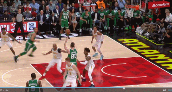 注意:为了降低对这个球的判断难度,我们认定特雷-杨是站在合理冲撞区里面。