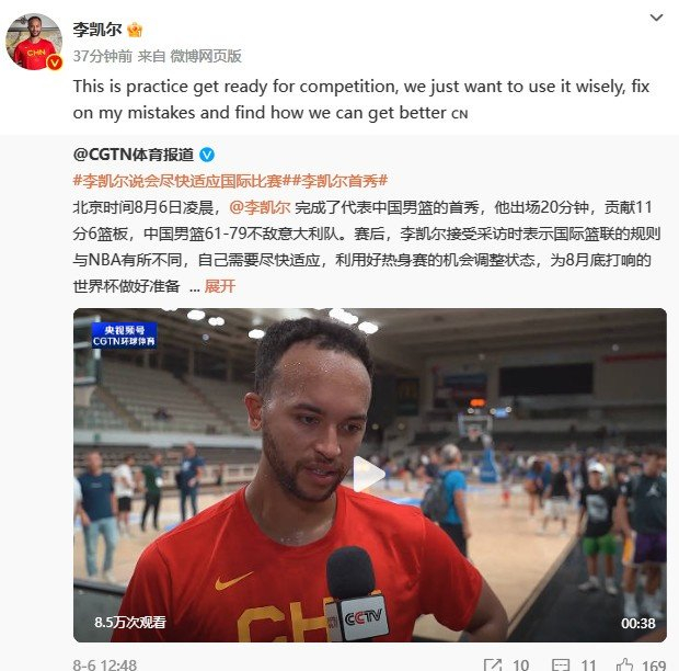 直播吧8月8日讯 今天,李凯尔在微博转发了自己赛后接受采访的视频,并写道:“这是一场为比赛(世界杯)做准备的热身赛。我们想聪明地利用这些热身赛,纠正我的错误,并搞清楚我们如何能够做得更好。”