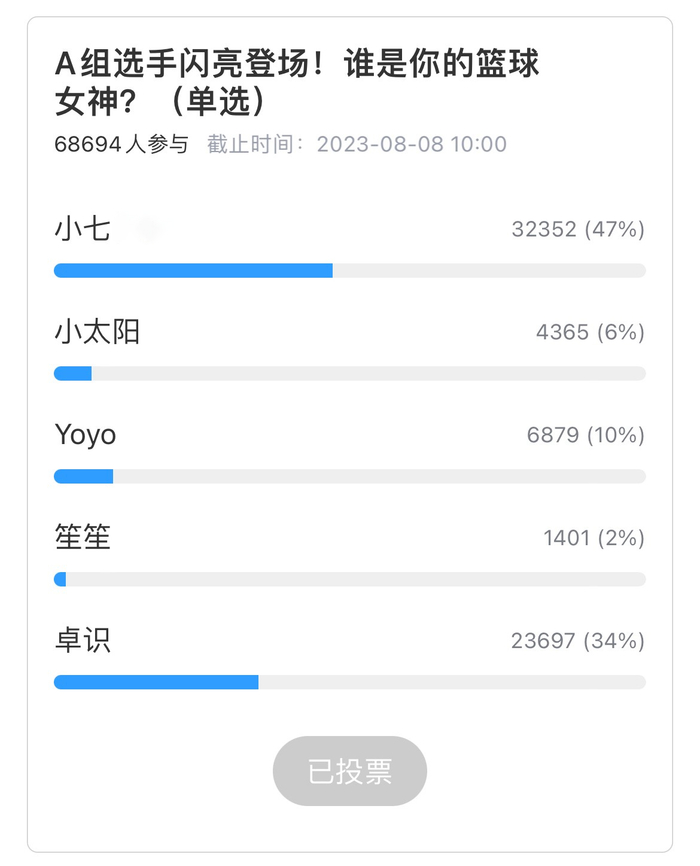 经过昨日的激烈比拼,小组赛A组前四名现已出炉,“卫冕冠军”小七依旧势不可挡,她以47%的得票率成为小组头名,卓识则以34%的得票率紧随小七之后,Yoyo和小太阳则分列小组三、四名。