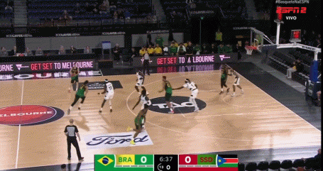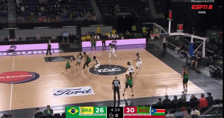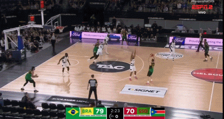 对持球人的高度施压,造成巴西队控卫出球失误,南苏丹打成反击