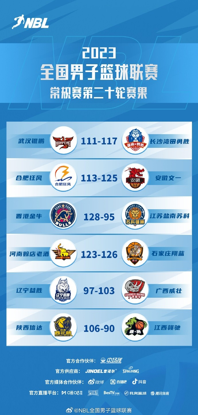 2023NBL联赛常规赛第20轮比赛今日结束,安徽同城德比,安徽文一实现对合肥狂风本赛季的双杀,广西威壮获得五连胜,陕西信达两外援迎来首秀。