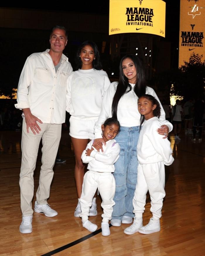 科比妻子瓦妮莎与三个孩子出席曼巴篮球邀请赛 并与佩林卡合影
