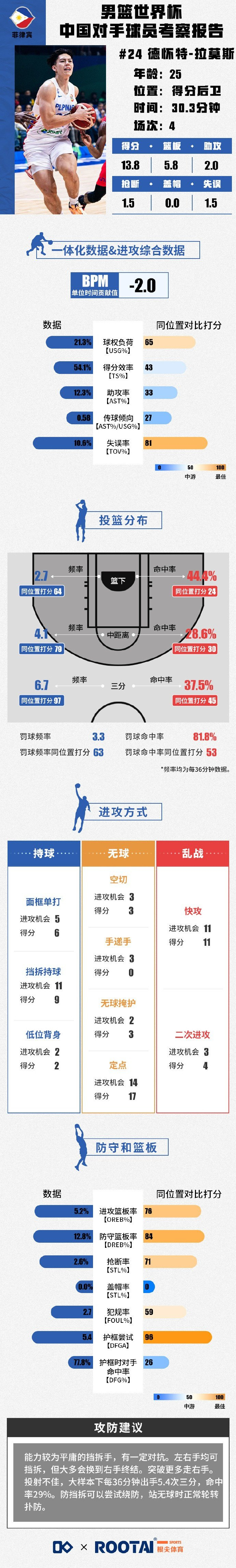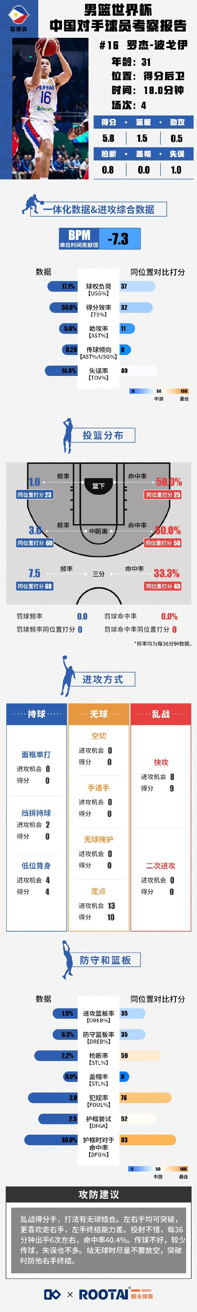 【中国队世界杯对手观察-菲律宾外线篇】中国男篮将在今天下午迎战#2023篮球世界杯#排位赛对手菲律宾,我们根据对手世界杯小组赛的数据,以及对手球员此前在联赛以及热身赛的表现,制作了详尽的单人数据报告。 #中国男篮vs菲律宾男篮#