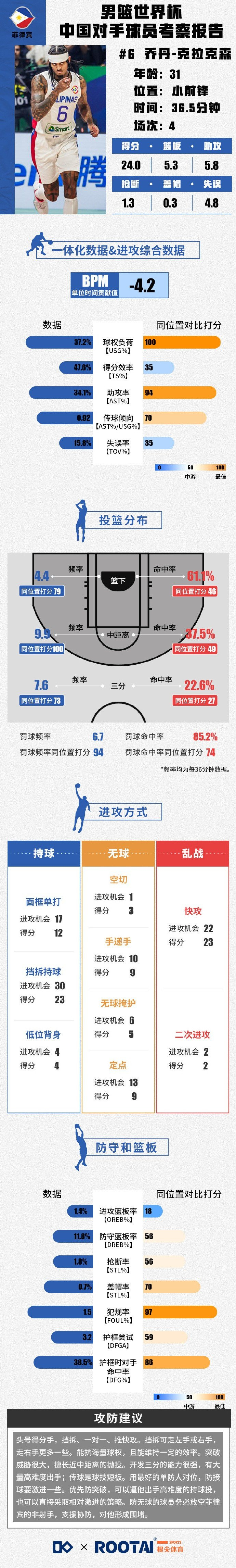 6号乔丹-克拉克森:头号得分手,挡拆、一对一、推快攻。挡拆可走左手或右手,走右手更多一些。能抗海量球权,且能维持一定的效率。突破威胁很大,擅长近中距离的抛投。开发三分的能力很强,有大量高难度出手;传球是球技短板。用最好的单防人对位,防接球要激进一些。优先防突破,可以逼他出手高难度的持球投,也可以直接采取相对激进的策略。防无球的球员务必放空菲律宾的非射手,支援协防,对他形成围堵。