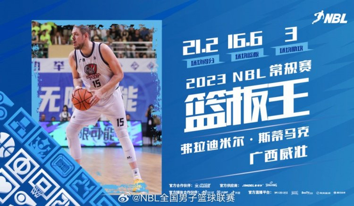 广西威壮外援弗拉迪米尔-斯蒂马克以场均16.6篮板获得2023赛季NBL联赛常规赛篮板王,本赛季常规赛,斯蒂马克场均能够得到21.2分16.6篮板3助攻,广西威壮位列常规赛积分榜第三位。