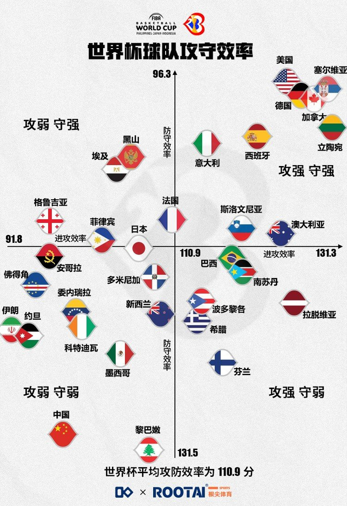 中国篮协技战术服务平台——K8数据分析团队更新男篮世界杯实力榜,以图表方式直观体现各队的攻防水准,原文如下: