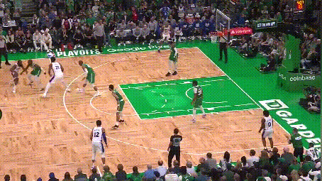有关恩比德的技术问题,我们会在这个系列后续的文章中再展开,这里可以简单归纳为一句——恩比德这时候已经无法靠个人能力创造投篮空间去硬解了。同时他又无法从跟哈登的挡拆中获得出手空间,因为哈登并不尝试压缩凯尔特人的防线,杀入篮筐不强起,甚至在一些明显有可能直入篮下的回合选择了传球。