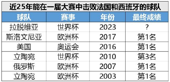 FIBA官方也在这场比赛之后晒出数据——过去25年时间里,能够在一届大赛中击败法国和西班牙的球队,最终都拿到了非常靠前的名次,没有人再会小看拉脱维亚了。