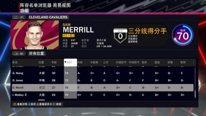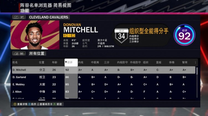 骑士全队2K24能力值:米切尔92 加兰86 莫布里85 阿伦83