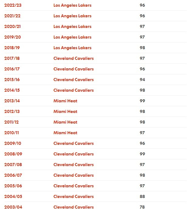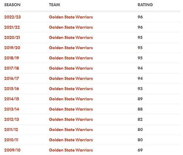 生涯21个赛季至今(包括新赛季),18次评分不低于96,伟大无需多言。