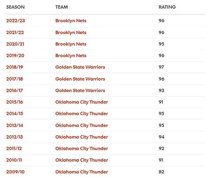 补充:KD生涯前两赛季2K能力值为80、83