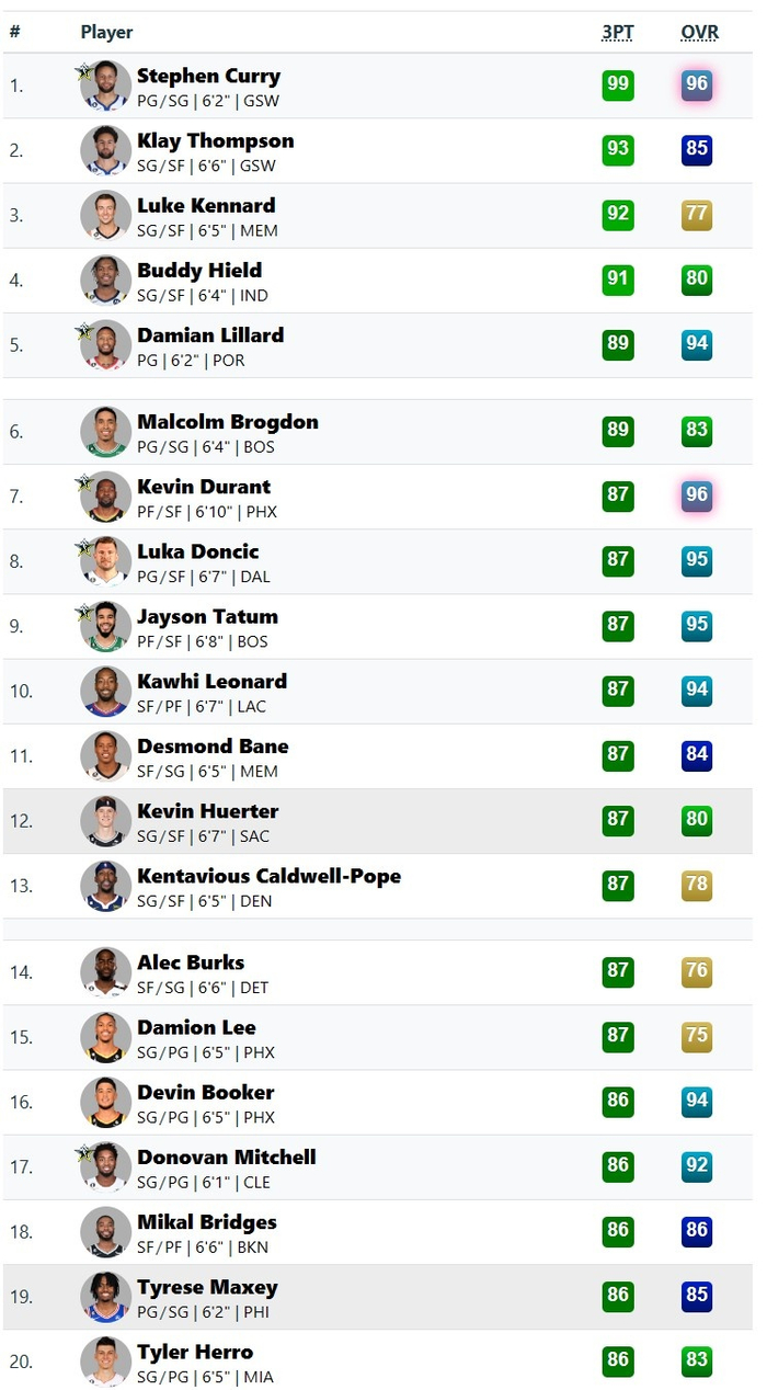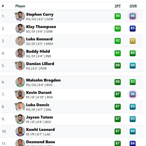 在三分球能力方面,库里以99的评分断层领衔,克莱排名第二,肯纳德排名第三,利拉德排名第五。