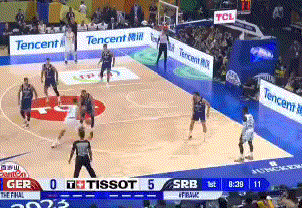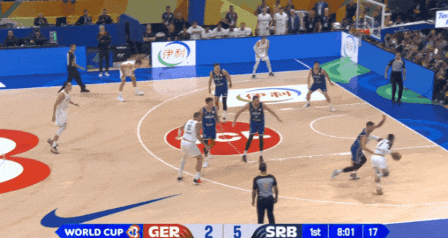 双方在开场的两个回合都找到了自己最习惯的进攻节奏——塞尔维亚利用自己的掩护给博格丹找三分手感,利用低位的手递手给约维奇找机会;德国队利用防守人的错位不断和弱侧转换的三分球做文章。