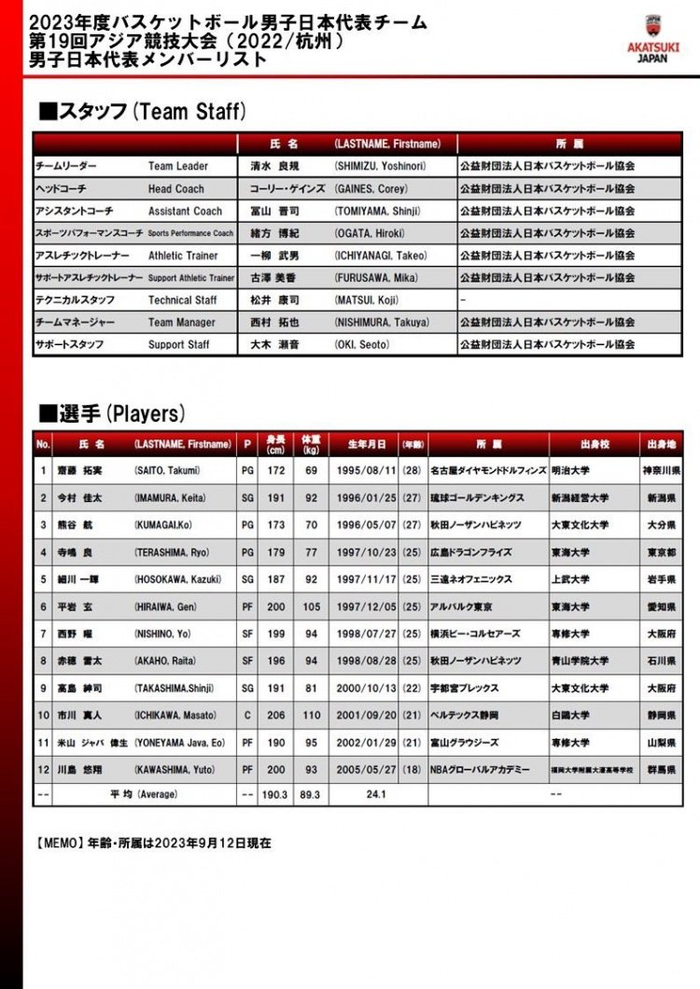 直播吧9月12日讯 日本篮协对参加本次杭州亚运会的12人大名单进行了调整。