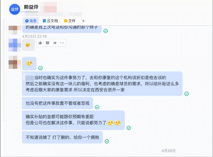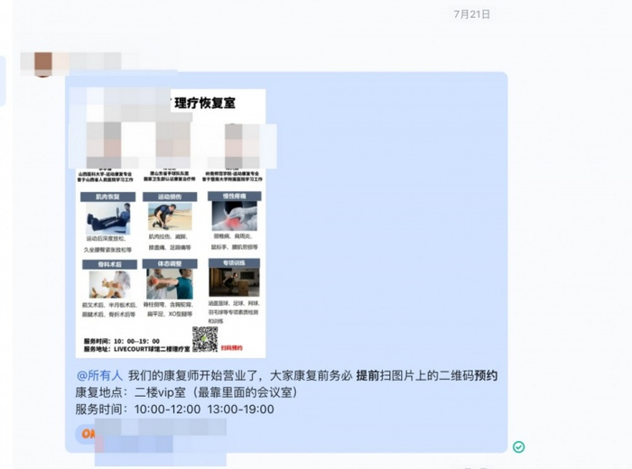 在此前,我们为球员购买了商业保险,在此之后,我们意识到康复治疗会是师傅们的一个常发需求,我们也专门组建了我们的康复团队(详见文末相关聊天记录),供师傅们免费使用。