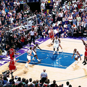 迈克尔-乔丹的伟大自不必多言。他在1991-93蝉联三连冠后选择退役打棒球,两年后他复出率领公牛又拿到了三连冠。1997-98赛季,乔丹率公牛取得62胜20负。季后赛首轮,公牛3-0轻取新泽西篮网,次轮4-1击败黄蜂,东决抢七淘汰步行者。在总决赛中,面对卡尔-马龙和斯托克顿领衔的爵士,乔丹仍旧笑到了最后。他在G6中关键抢断+晃倒拉塞尔后的“the last shot”,成为永恒的经典。