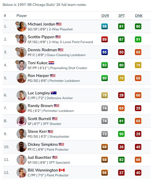 在2K系列最为基础的“快速比赛”模式中,玩家们除了可以选择当前赛季的各支球队,还能选择许多经典球队。今天我们给大家介绍的球队是1997-98赛季的公牛。