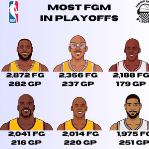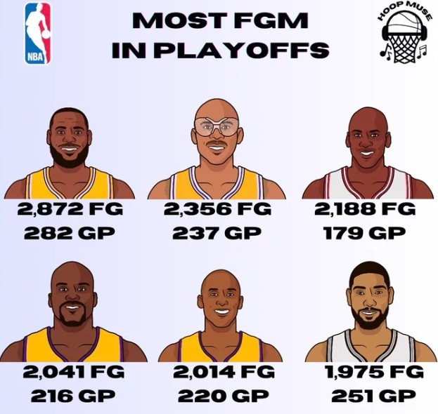 季后赛总进球数排行榜:詹姆斯2872记压天勾第一 乔三科五邓六