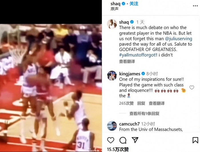 奥尼尔:GOAT之争有争议但别忘J博士 詹姆斯:他激励了我