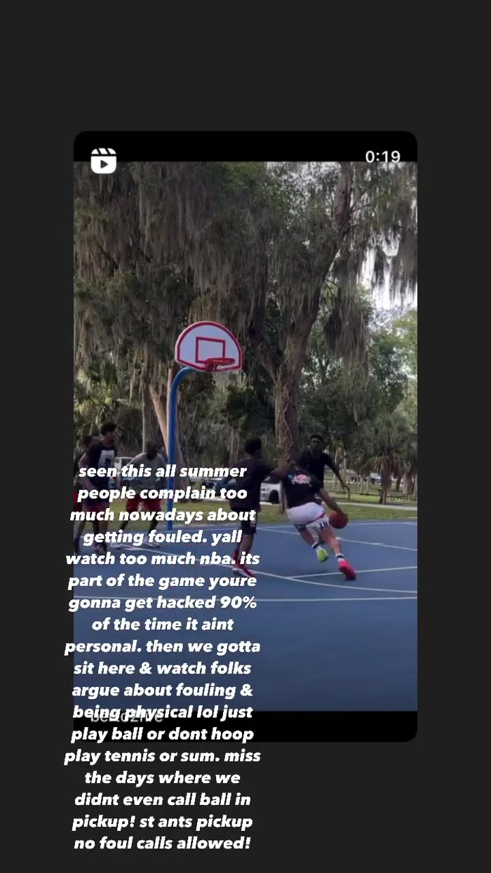 “让我们专注于打球,或者你也别打篮球了,去打网球或者玩别的运动。怀念那些我们在野球场从来不喊被犯规的日子。”