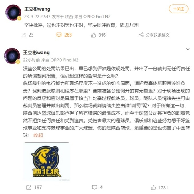 博主后厂村体工队在微博写道:“其实陕西队退赛当天,王立彬还表示将加强对球员和教练们的教育,基本上和官方还是站在一起的。但篮协的官方通告出来以后,王立彬的态度就有重大转变了。”