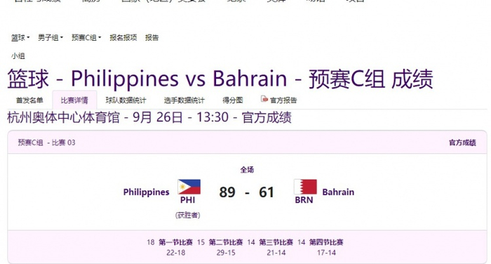 中新网杭州9月26日电(记者 李赫)26日,杭州亚运会五人制篮球项目的比赛开打。已经结束的一场比赛中,菲律宾男篮89:61大比分击败巴林队。在不久前的男篮世界杯上,菲律宾男篮曾大胜中国队21分。转战亚运赛场,新上任的菲律宾男篮主帅CONE Earl Timothy表示,想要再次击败中国男篮难度很大,目标是与中国队在决赛相遇。