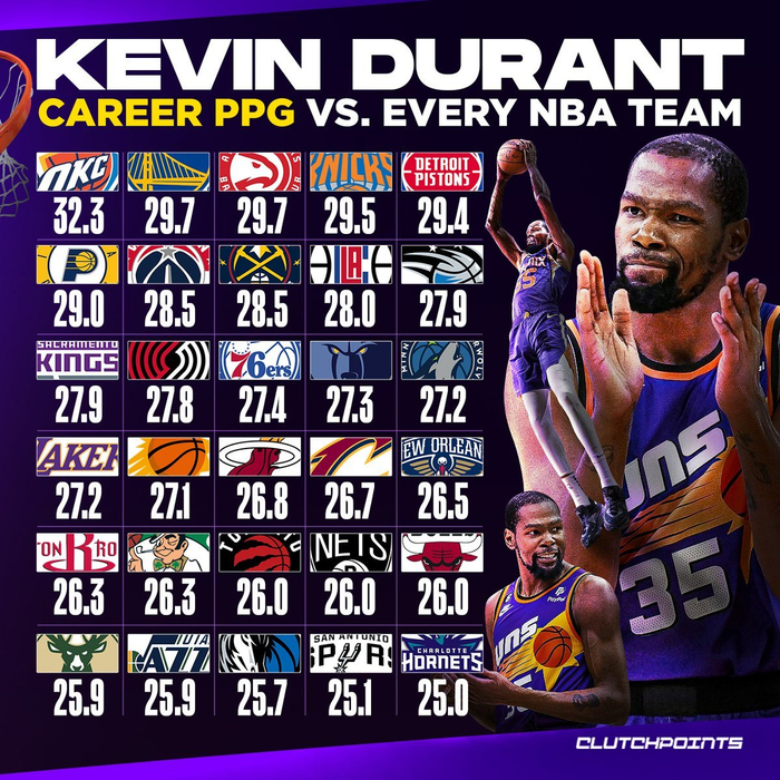 KD生涯对阵各队平均得分:全部达到25历史唯一 VS雷霆32.3分