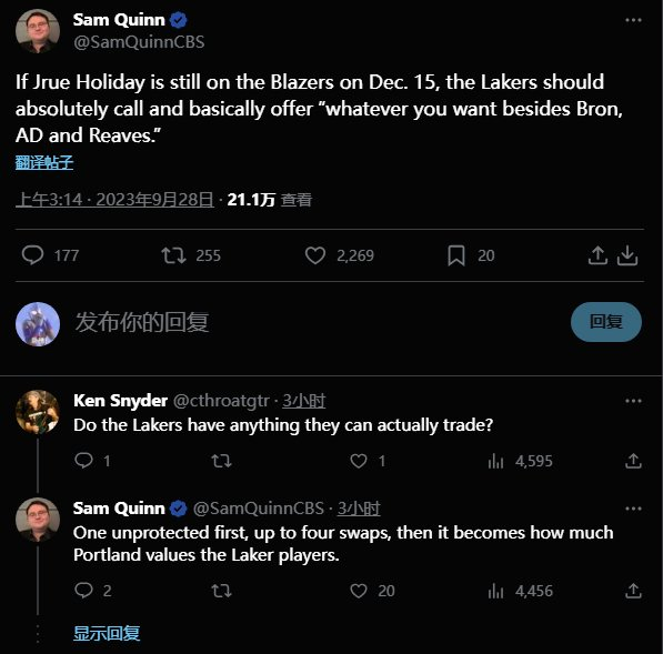 Sam Quinn回复:“一个不受保护的首轮,最多四个交易互换权,主要还是看开拓者想要湖人的哪位球员。”