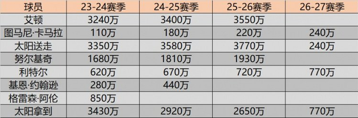 可以看到,虽然交易后太阳在23-24赛季的薪资略有增加,但24-25和25-26两个赛季薪资都降低了不少。更重要的是,“整钱换零”,把溢价合同一份一份出掉,会比出个大的容易,太阳交易后方便了未来运作。