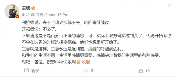 王猛在个人微博上写道:“利拉德说,去不了热火那就不去,咱回来继续过!