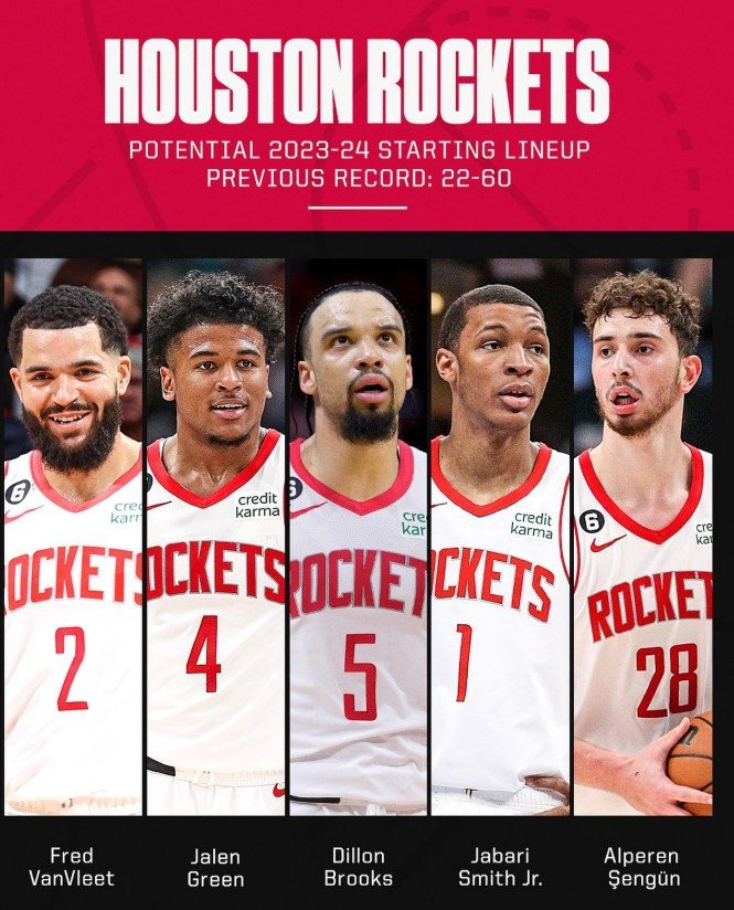 首发5人分别为:范弗里特、杰伦-格林、狄龙、小贾巴里-史密斯、申京。