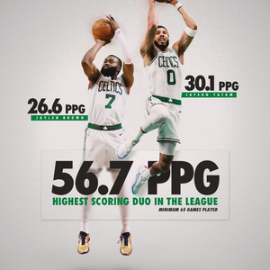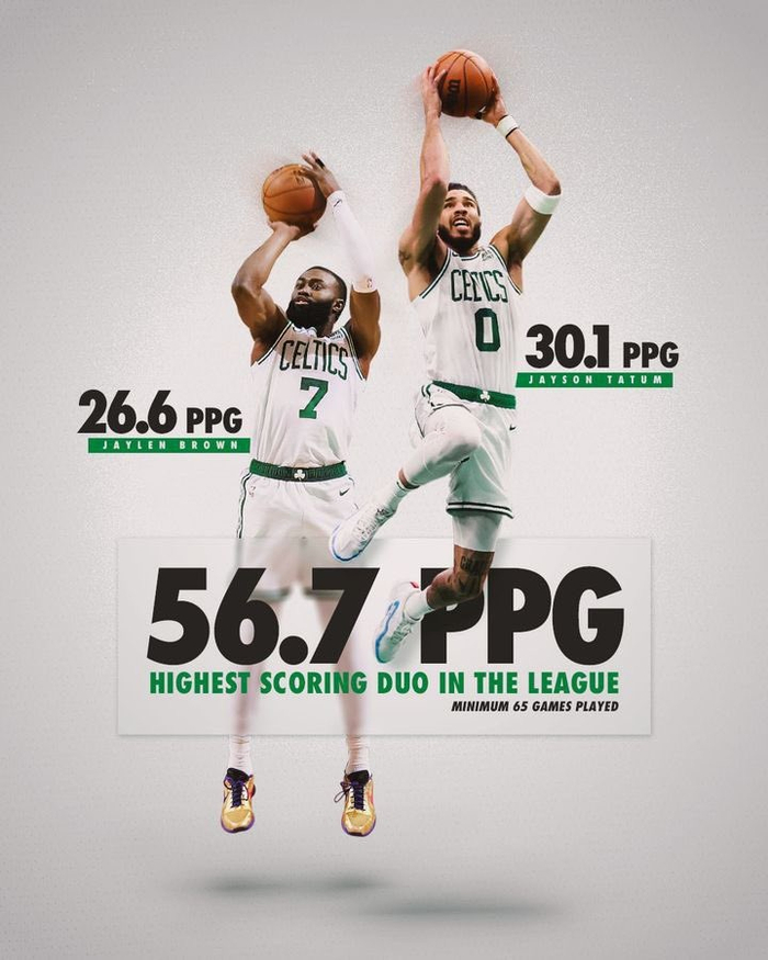 直播吧10月2日讯 凯尔特人官推今日晒出塔图姆与杰伦-布朗的合成图,塔图姆上赛季场均得到30.1分,布朗场均26.6分,合计56.7分。为上赛季场均得分最高的双人组(至少出战65场)。