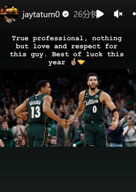 塔图姆更新INS告别布罗格登,他写道:你是真正的职业球员,对你只有爱与尊重。祝你新赛季好运。