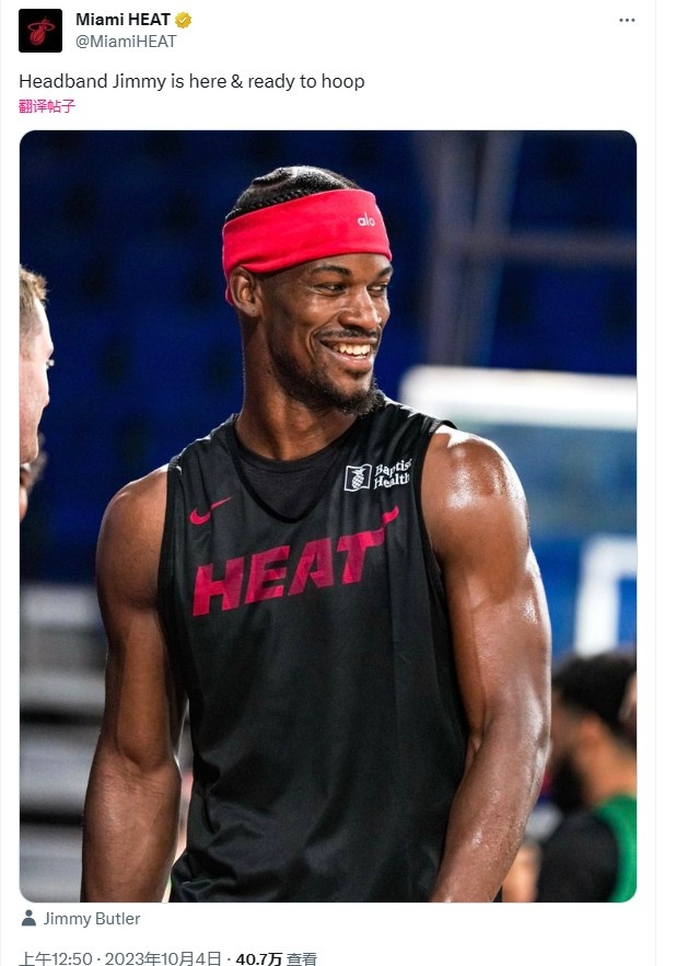 热火官推写道:“头带版巴特勒抵达训练营并准备开练了!”