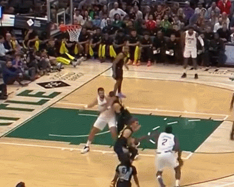 接下来两个动图则是莱昂纳德本场投三分的画面。乔治本场虽投篮不利,但他对球的调度做的还是很到位的。两个球都是乔治在边线接内传外的传球,然后将球传到三分线外的莱昂纳德,后者略做调整,张手命中,一次在45度角,一次在弧顶中央。莱昂纳德和乔治的配合是快船的固定戏码,他俩站在外线就是两个威胁点。