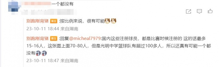 媒体人别跑刚背猪更博写道:“关于网上有提到国内篮球注册球员少的问题,我觉得挺无语的。其实注册球员数量是完全无法体现目前国内从业人员数据的。举个例子吧,下图是某篮球名校的篮球队日常训练的人数(不是全部哦),大家猜一猜,这张图里面有多少人算注册球员?”