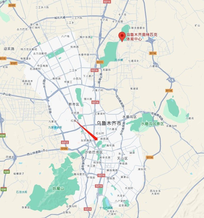 新疆队的新主场球馆奥体中心建在了北边,而原来的主场红山体育馆则在市中心(大概在箭头处)