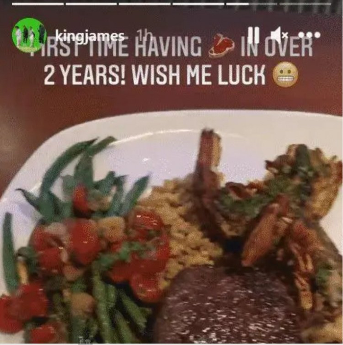 詹姆斯就是如此选用食物,多少年来不曾改变过。偶尔食用一次牛排,他还要发社交媒体感慨一番:“这是我两年来吃的第一顿牛排,祝我好运。”