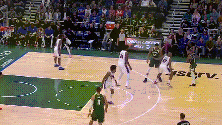 第一种,当对手缺少大体型内线屏障的时候,要增加无球队员对篮筐、篮板球的冲击。因为防守兵力被利拉德拉到上线后,字母、洛佩斯、波蒂斯等人有机会建立篮下的优势位置。76人有恩比德,不属于这种情况;
