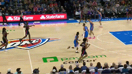 第一件事,他把终结型中锋该有的比赛内容拉到了极致。场均15.5分,13.3篮板,其中5.3个前场篮板,还有2个封盖0.8抢断,真实命中率69%——很逆天了,即使是对数据没那么敏感的球迷,看到5.3个前场篮板应该也会震惊,而杜伦的以上数字,在小样本下是全包围上个赛季的阿伦的。看他这一手,从弧顶突然启动,隔人滞空后躺完成终结,身体能力和手上感觉都不一般。