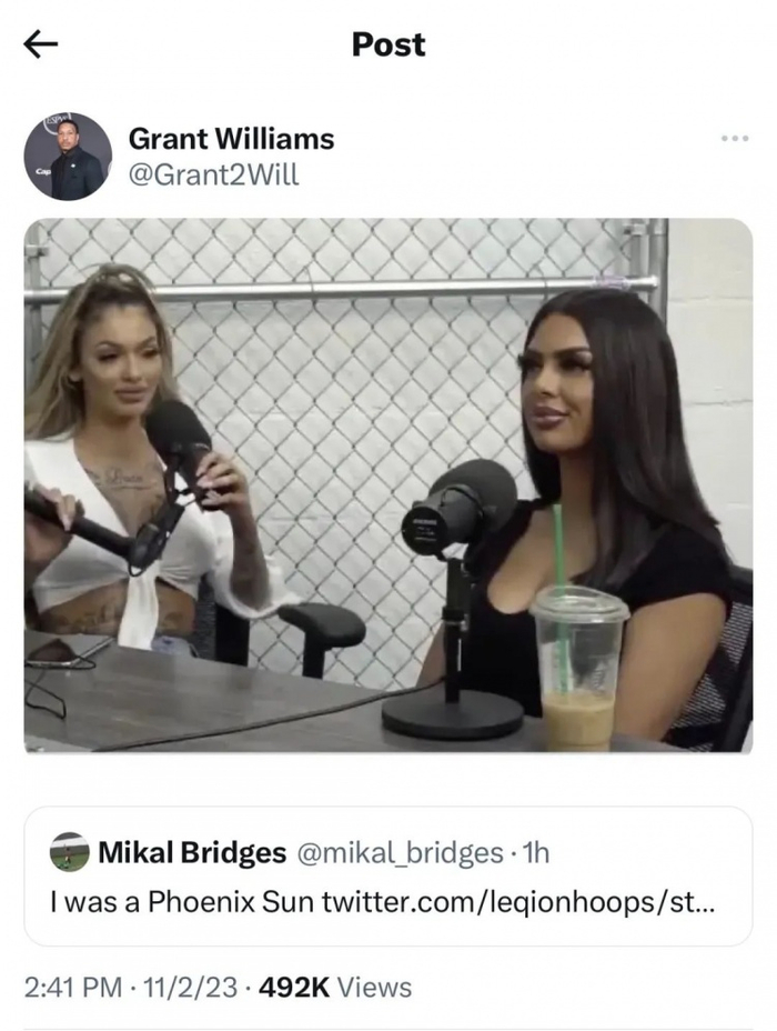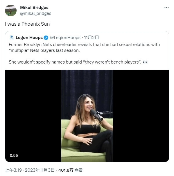目前该视频的播放量已经接近600万,包括杜兰特欧文在内的许多球星都被拉下水。而第一个绷不住的人是米卡尔-布里奇斯,他转发了这段视频,并辩称“我当时在太阳队”,瞬间成为圈中笑谈。