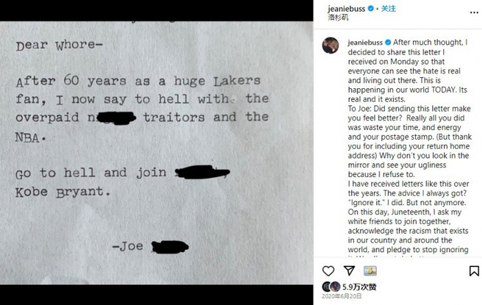 一直骄傲宣称自己是“湖人女郎”的珍妮曾公开自己遭到威胁骚扰的邮件。虽然她也对男球员使用过诸如“帅气性感”之类不太妥当的形容词,但这种逾矩跟她的某些负面评价显然并不对等