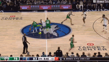 镜头三:李凯尔逢掩护穿过,不给杰伦-布朗可乘之机,后者无奈之下把球交给波尔津吉斯。戈贝尔再次展现最佳防守球员的实力,面对对方连续的假动作完全没有吃晃,完美保持住了身体的平衡,最终成功完成封盖。